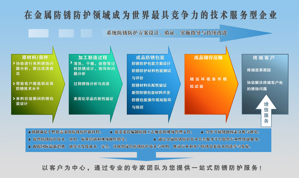 通過一站式、標(biāo)準(zhǔn)化、差異化、增值化的服務(wù)來(lái)降低客戶的心理成本和使用成本,最終提高客戶的收益,使沈陽(yáng)防銹服務(wù)“超越客戶期望,超越行業(yè)標(biāo)準(zhǔn)”,成為防銹業(yè)服務(wù)的旗艦品牌。