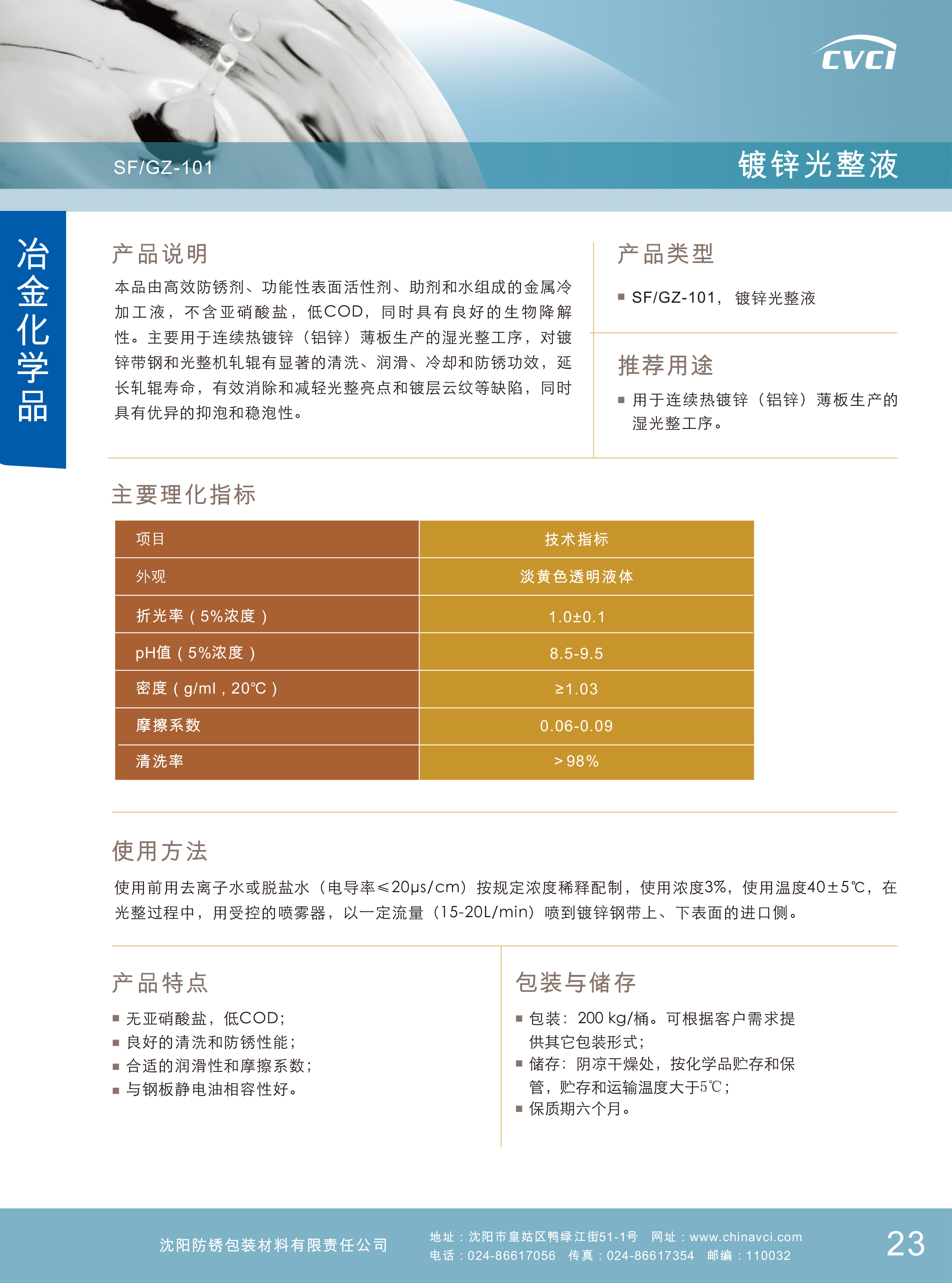 由高效防銹劑、功能性表面活性劑、助劑和水組成的金屬冷加工液,不含亞硝酸鹽,低COD,同時具有良好的生物降解性。主要用于連續(xù)熱鍍鋅(鋁鋅)薄板生產(chǎn)的濕光整工序,對鍍鋅帶鋼和光整機(jī)軋輥有顯著的清洗、潤滑、冷卻和防銹功效,延長軋輥壽命,有效消除和減輕光整亮點(diǎn)和鍍層云紋等缺陷,同時具有優(yōu)異的抑泡和穩(wěn)泡性。