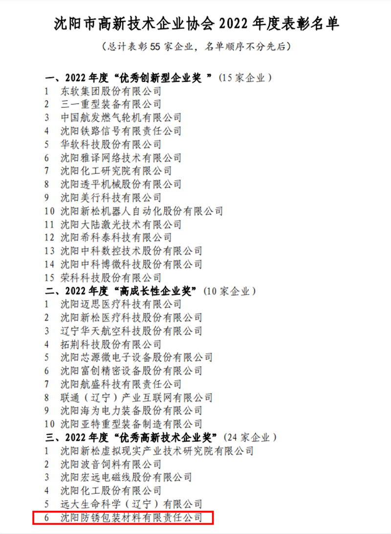 會(huì)議中,高企協(xié)會(huì)對(duì)全市高新技術(shù)企業(yè)中的優(yōu)秀代表企業(yè)進(jìn)行了表彰,周舟副市長(zhǎng)等各界領(lǐng)導(dǎo)同志為獲獎(jiǎng)企業(yè)頒發(fā)榮譽(yù)證書及獎(jiǎng)杯,沈陽防銹榮獲2022年度“優(yōu)秀高新技術(shù)企業(yè)”獎(jiǎng)。
