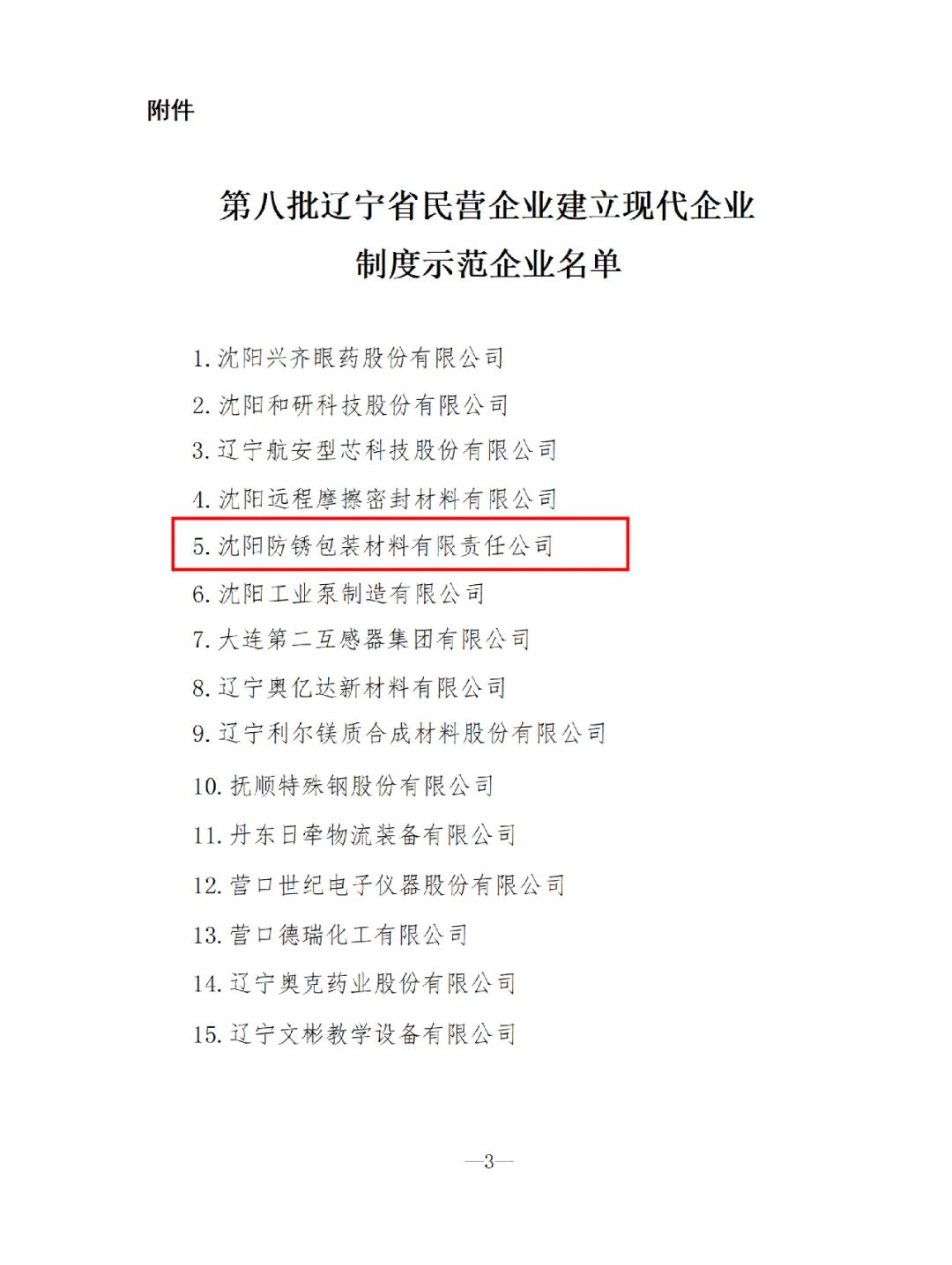 2023年,9月3日遼寧省工信廳公布第八批省民營企業(yè)建立現(xiàn)代企業(yè)制度示范企業(yè)名單,沈陽防銹成功入選。
