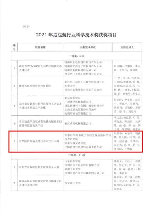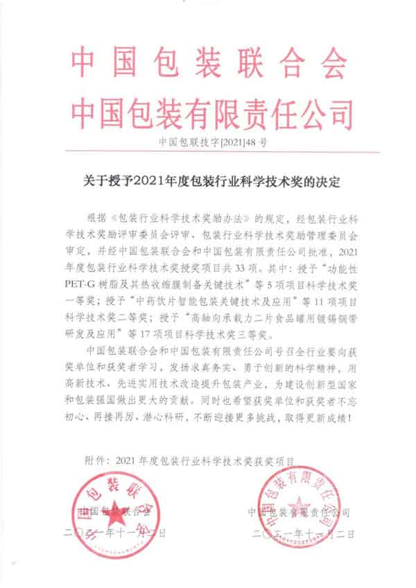 包裝行業(yè)科學(xué)技術(shù)獎(jiǎng)是經(jīng)國(guó)家科學(xué)技術(shù)部核準(zhǔn)登記,由中國(guó)包裝聯(lián)合會(huì)和中國(guó)包裝責(zé)任有限公司共同設(shè)立的面向包裝行業(yè)的科學(xué)技術(shù)綜合性獎(jiǎng)項(xiàng)。該獎(jiǎng)每年評(píng)審一次,主要從技術(shù)創(chuàng)新、技術(shù)難度、對(duì)相關(guān)領(lǐng)域或行業(yè)的技術(shù)推動(dòng)作用以及經(jīng)濟(jì)和社會(huì)效益等幾方面進(jìn)行綜合評(píng)估,對(duì)有突出表現(xiàn)的申報(bào)項(xiàng)目做出評(píng)定,并綜合各個(gè)方面的分?jǐn)?shù)給予相應(yīng)的等級(jí)獎(jiǎng)項(xiàng)。今年的授獎(jiǎng)項(xiàng)目共33項(xiàng),其中一等獎(jiǎng)5項(xiàng),二等獎(jiǎng)11項(xiàng),三等獎(jiǎng)17項(xiàng)。