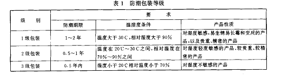 ①包裝的防潮等級(jí)應(yīng)根據(jù)產(chǎn)品的性質(zhì)、流通環(huán)境、儲(chǔ)運(yùn)時(shí)間、包裝容器的一般性能等因素來(lái)確定防潮包裝等級(jí)分為1級(jí)包裝、2級(jí)包裝、3級(jí)包裝,詳見(jiàn)表1。